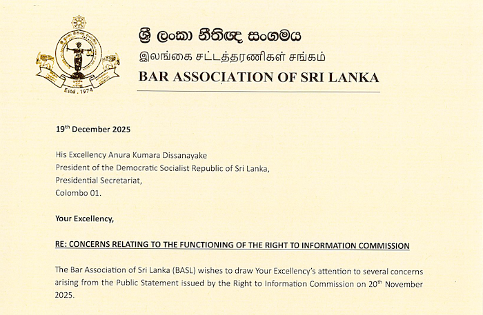 In a letter dated 19 December 2025 and addressed to the President, the BASL referred to concerns arising from a public statement issued by the Right to Information Commission on 20 November 2025. The association stressed that the Commission, established under the Right to Information Act No. 12 of 2016, plays a vital role in protecting citizens’ constitutional right to access information as guaranteed under Article 14A of the Constitution.