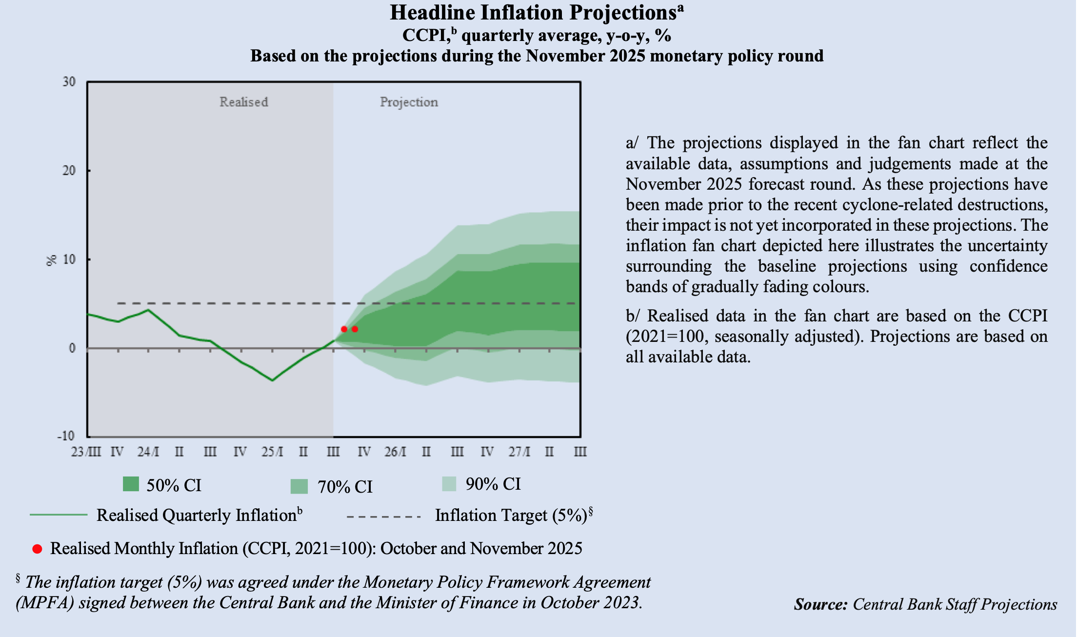 The Central Bank’s latest inflation projections, prepared during the November 2025 monetary policy round, point to a gradual rise in inflation toward the 5% target established under the Monetary Policy Framework Agreement. However, officials caution that the trajectory may shift depending on the extent of price pressures arising from recent cyclone-related disruptions, the full impact of which is still under assessment and not yet factored into current forecasts.