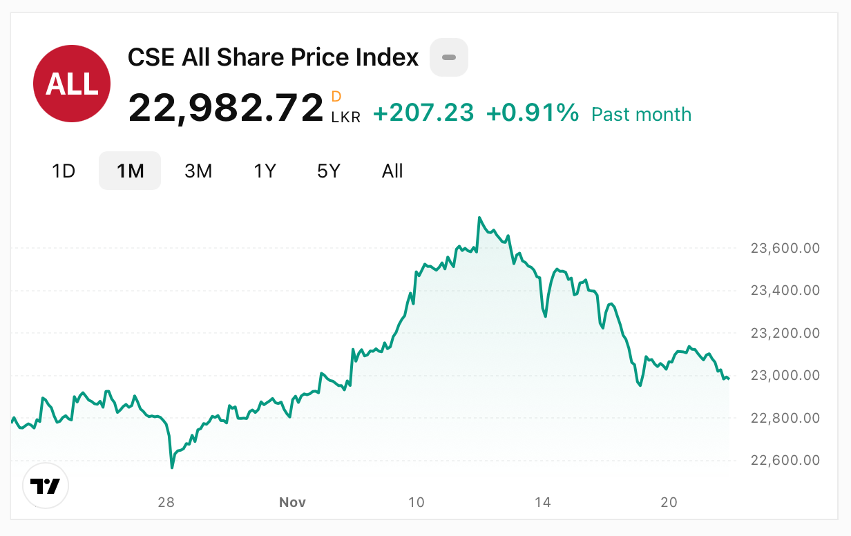 As of November 22, 2025, the All Share Price Index (ASPI) of the Colombo Stock Exchange (CSE) is experiencing some fluctuations. The ASPI closed at 22,982.72 points on November 21, 2025, reflecting a 0.53% decrease from the previous day. This decline follows a recent peak where the index reached 23,745.23 points on November 12, 2025, marking a year-to-date increase of approximately 77.03%compared to the same period last year (source: Country Economy).