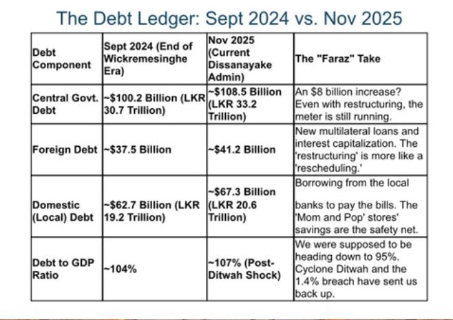 How did we get here? Well, it’s a mixture of ‘new money’ for the Ditwah recovery, interest that we aren’t paying but is still being added to the pile (capitalization), and a government that has found it ‘necessary’ to breach its own borrowing limits by 1.4%.