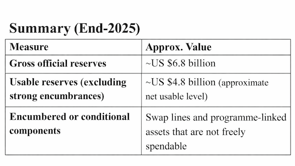 However, usable reserves excluding swaps and conditional assets are significantly lower. According to central bank and IMF reporting practices, reserves net of swap arrangements were previously estimated near US $4.8 billion by late in 2025. This reflects reserves that are more freely available to cover essential imports and debt obligations.