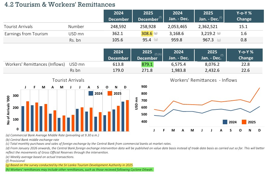 Sri Lanka’s external sector in 2025 was increasingly underpinned by workers’ remittances, which surged to record levels, even as foreign tourism revenue lagged behind growth in arrivals, highlighting a widening divergence in the country’s key foreign exchange earners.