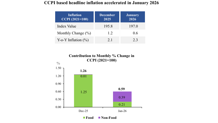 “On a month-on-month basis, the CCPI recorded an increase of 0.59% in January 2026. The Food category contributed 0.21 percentage points to this increase, while the Non-Food category contributed 0.39 percentage points,” the central bank reported.