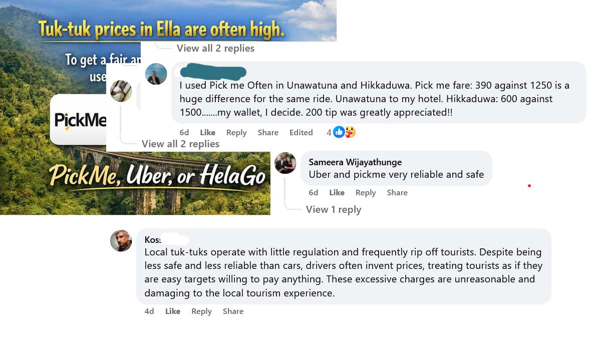 In regions like Ella, complaints on social media have increased due to three-wheeler fares being artificially inflated by cartel-like practices. PickMe CEO Jiffry Zulfer emphasized that no individual or informal group has the authority to claim exclusive rights over public roads or national tourist sites. He reiterated that every Sri Lankan citizen has a constitutional right to lawful employment and freedom of movement.