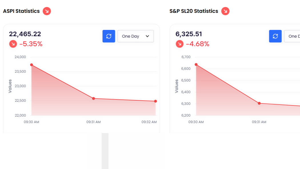 The All Share Price Index (ASPI) fell by 5.27 percent, or 1,250.30 points, reaching 22,483.76. Similarly, the S&P SL20 index decreased by 5.53 percent, or 366.97 points, to settle at 6,269.00.