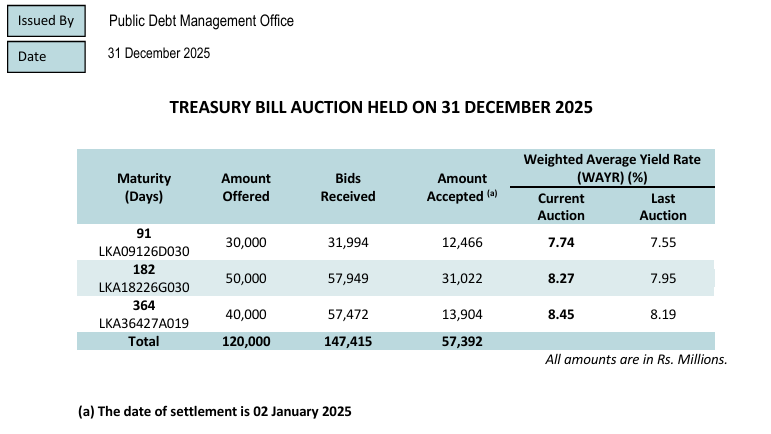 FINANCIAL CHRONICLE – Data from Sri Lanka’s Public Debt Management Office indicates an increase in Treasury bill yields across various maturities at the auction held on Wednesday. Notably, the 6-month yield experienced a rise of 32 basis points, reaching 8.27 percent.