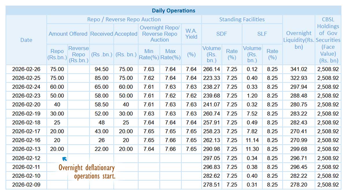 The central bank commenced overnight repo auctions, a deflationary measure, on February 13, 2026, when excess liquidity hit 297 billion rupees due to balance of payments developments and inflationary swaps. Overnight withdrawals have since increased to 75 billion rupees at 7.64%. Term operations began on February 25, at 7.74%.