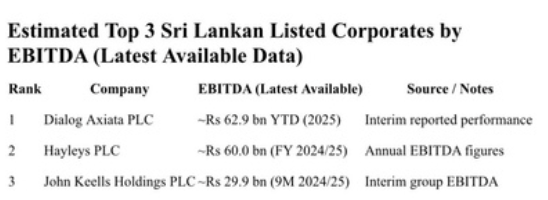 Dialog’s 2025 year-to-date EBITDA has been cited at around Rs 62.9 billion, driven by mobile and broadband operations — a figure that likely places it near or above Hayleys in absolute terms based on interim reporting.