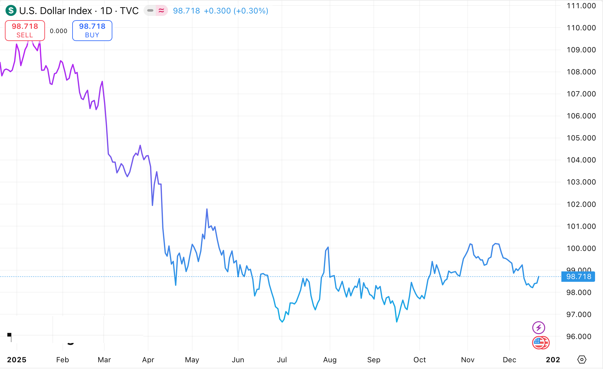 As of December 21, 2025, the DXY stood at roughly 98.7, reflecting broader market caution amid slowing U.S. economic data and speculation about the Federal Reserve’s monetary policy trajectory.