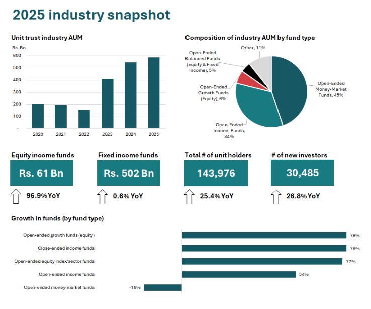 The Unit Trust industry in Sri Lanka experienced a 7.8% year-over-year increase in its assets under management (AUM), reaching Rs. 587 billion by the end of 2025. Throughout the year, the AUM peaked at Rs. 613 billion, demonstrating sustained interest in this asset category. Currently, these assets are distributed across 86 funds managed by 16 companies.